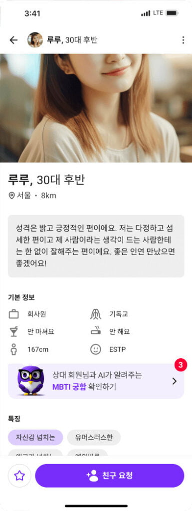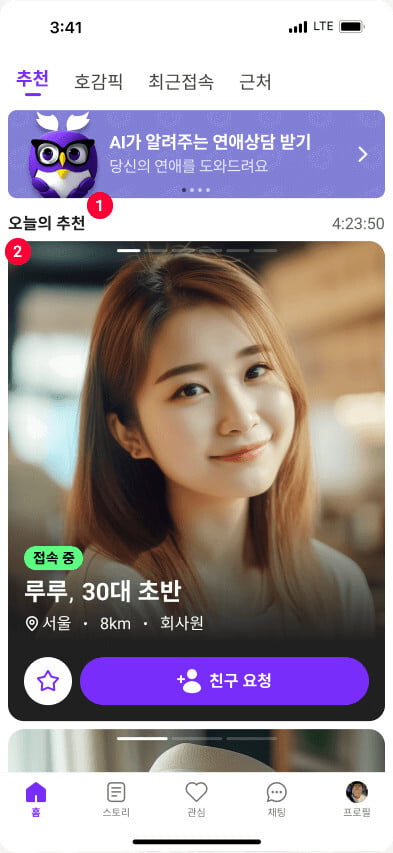 나이, 접속 시간, 거리 등의 정보를 기반으로 매일 새로운 이성 추천