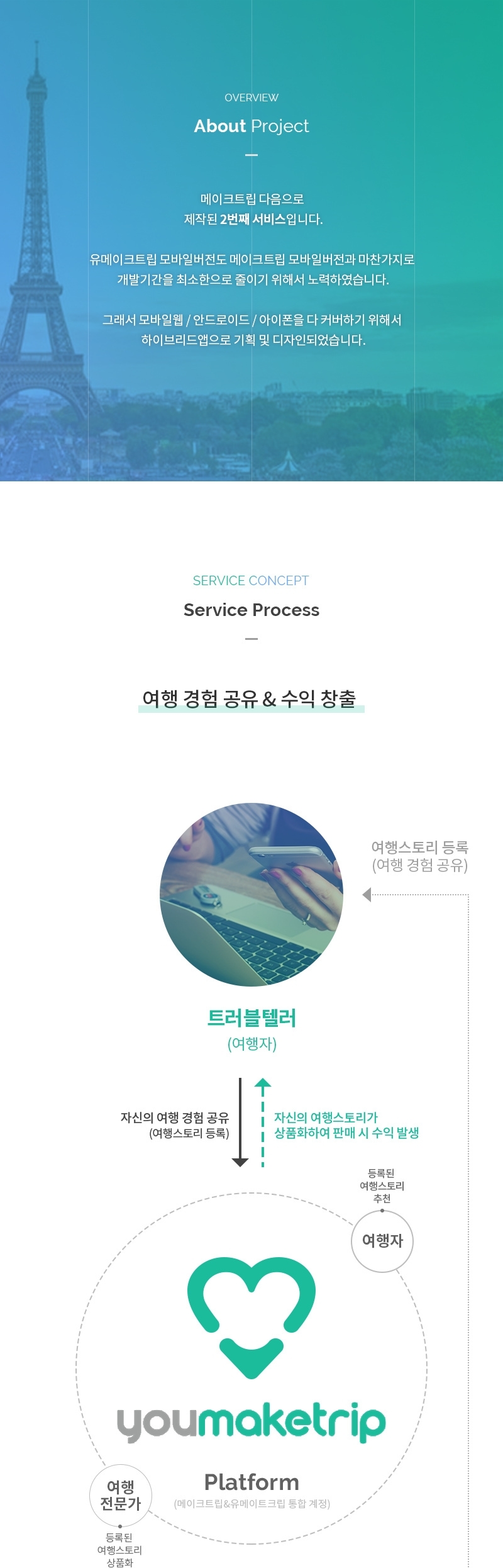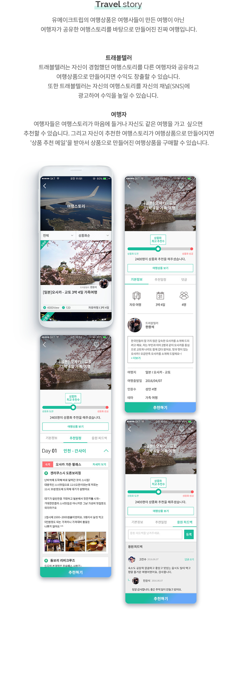 유메이크트립은 트래블 텔러(여행 경험을 공유한 여행자)들의 소중한 여행 경험을 공유하면 여행전문가(여행사&랜드사)들이 여행 상품으로 만들어 수익이 발생하면 트래블러(여행 경험을 공유한 여행자)와 수익을 공유하는 서비스입니다.